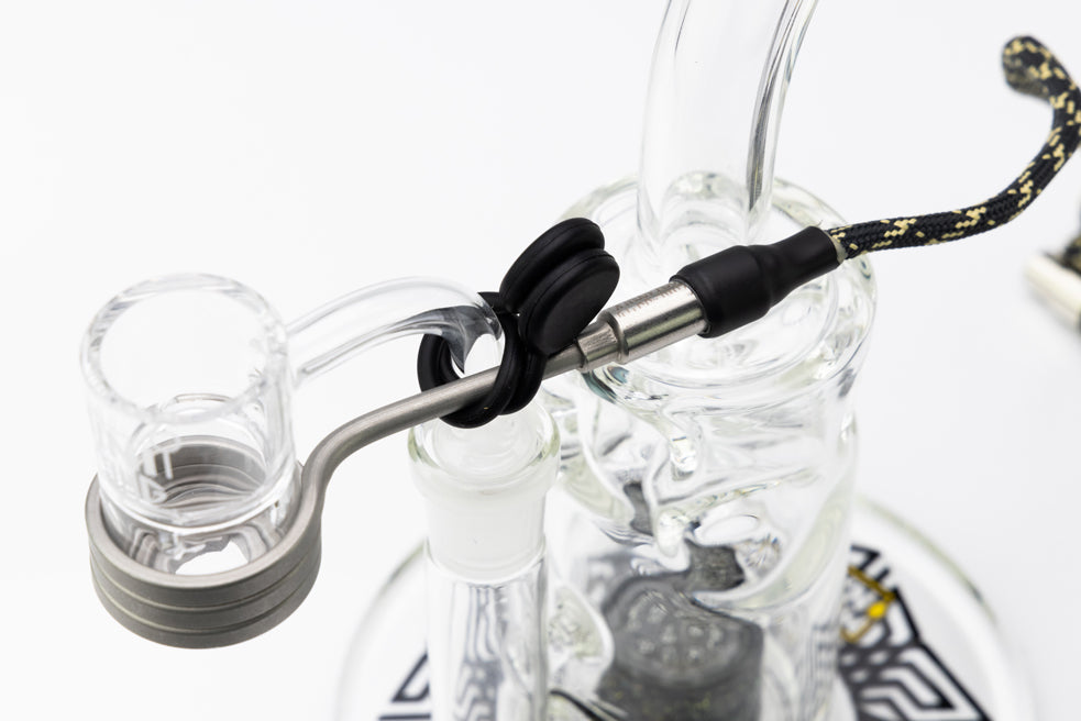 The GLOBSTOPPER is the first collaboration between MiniNail and Black Market Glass and features CENTRIPETAL FORCE. Unlike centrifugal force, centripetal force brings everything to the center during rotation. Because the rotation doesn’t rotate toward the walls (then up, and down the arm) we are able to cut a lot of the height needed to function properly.